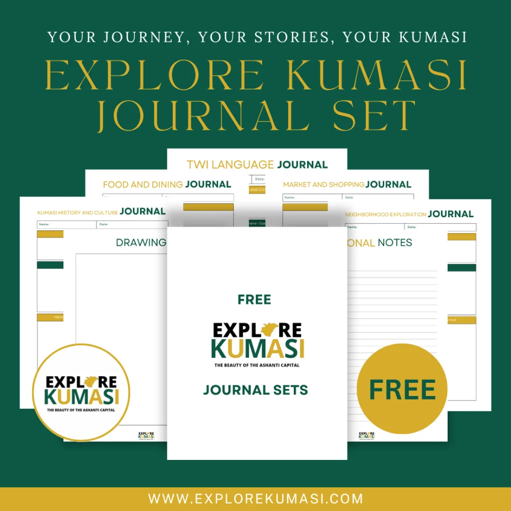This free journal set is the perfect companion for exploring Kumasi. Document your experiences as you visit attractions, explore neighborhoods, learn Twi, and immerse yourself in the vibrant culture of the Ashanti Region.